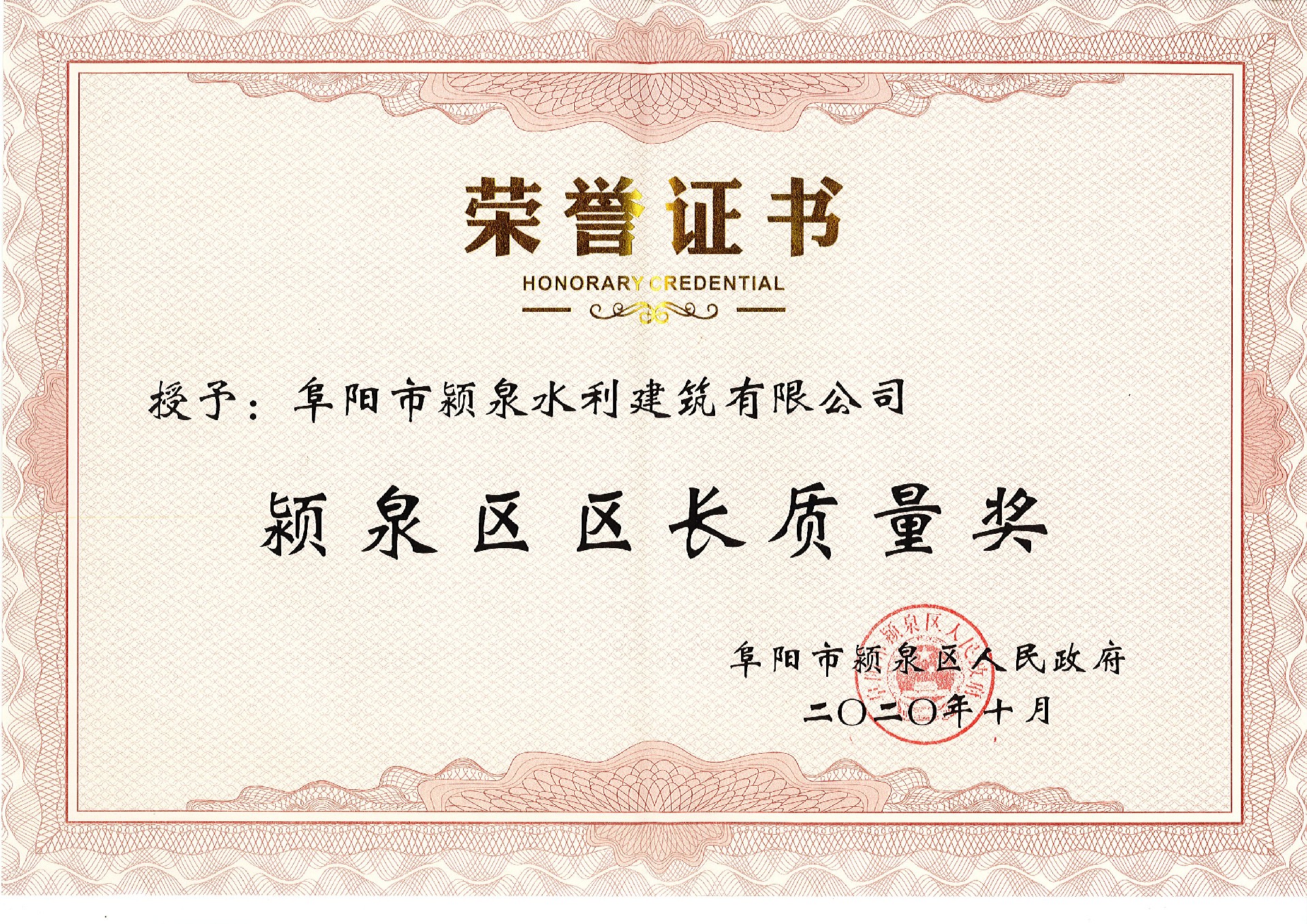 經(jīng)資格審查、資料評(píng)審、專(zhuān)家組現(xiàn)場(chǎng)復(fù)查并經(jīng)潁泉區(qū)政府第65次常務(wù)會(huì)議研究通過(guò)我公司榮獲2019-2020年度區(qū)長(zhǎng)質(zhì)量獎(jiǎng)。
