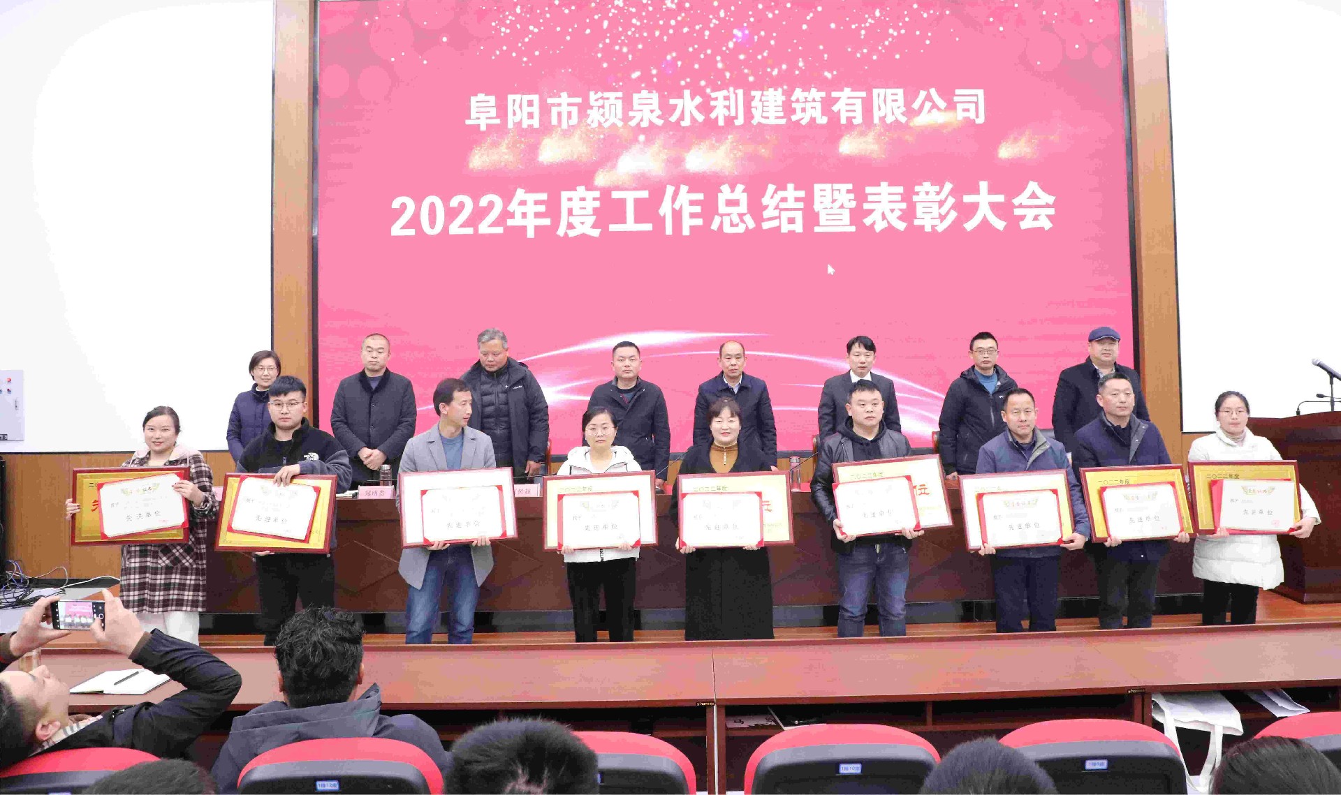 2023年2月27日,阜陽市潁泉水利建筑有限公司2022年度工作總結(jié)暨表彰大會在潁泉區(qū)委黨校順利召開。應(yīng)邀出席會議的有潁泉區(qū)水利局黨組書記、局長季超,潁泉區(qū)水利局黨組成員、設(shè)計室主任謝皓,公司領(lǐng)導班子成員韓記、孫雷、常猛、鄭明貴、胡向真,監(jiān)事長劉樹超等在主席臺就座,各項目部、科室負責人以及100多名職工參加會議。